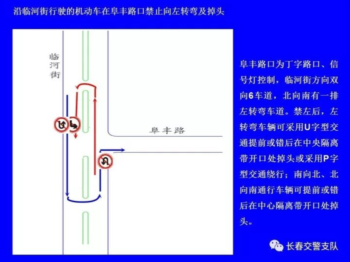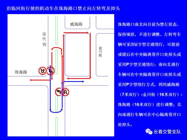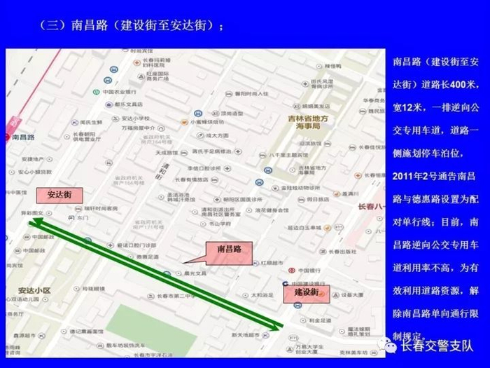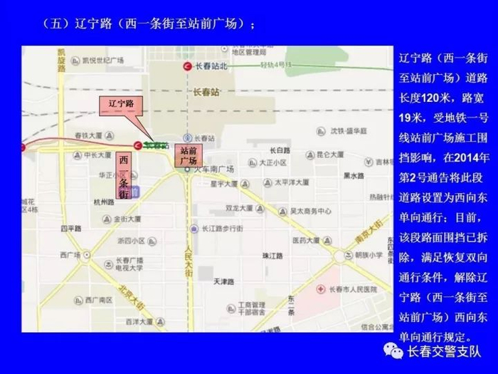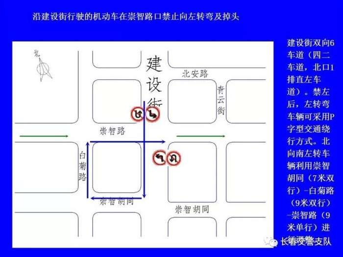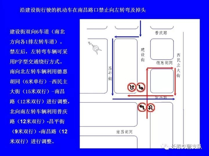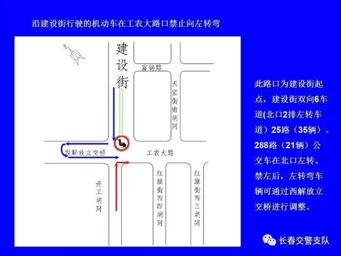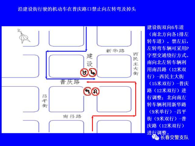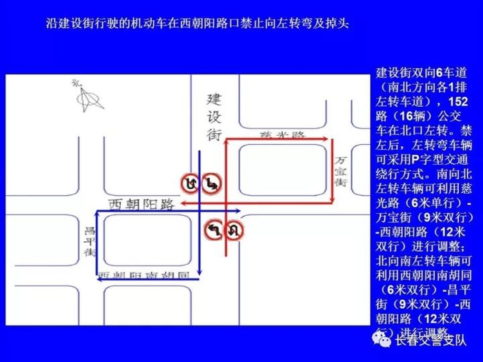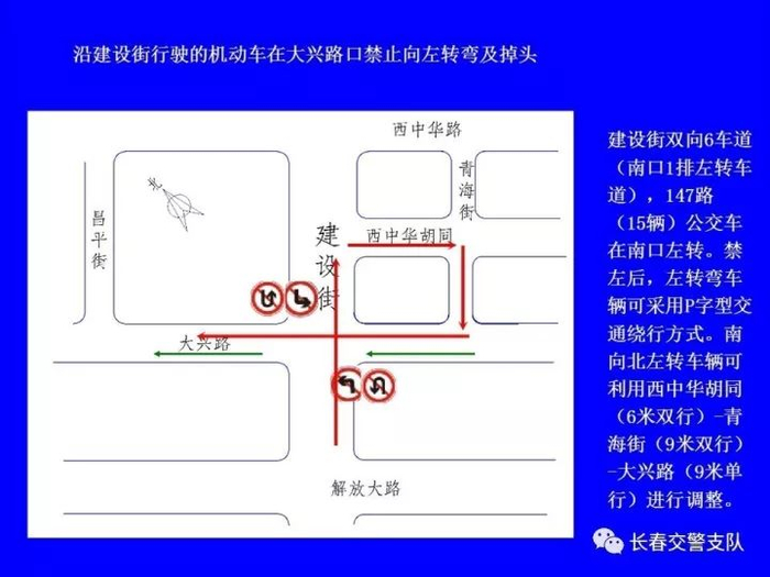1、沿建设街行驶的机动车在工农大路口(允许掉头)、解放大路口、大兴路口、西中华路口、西朝阳路口、南昌路口、普庆路口、新华路口、西安大路口、崇智路口和北安路口禁止向左转弯及掉头。