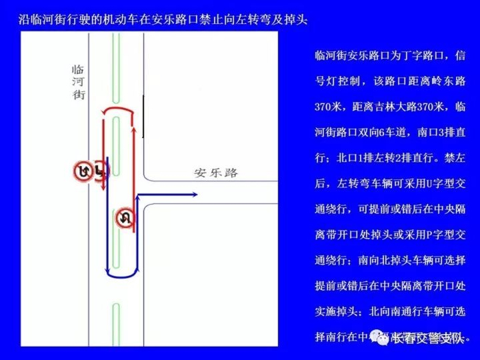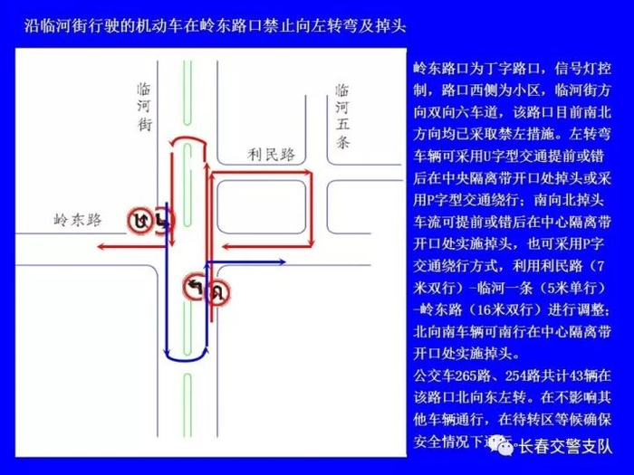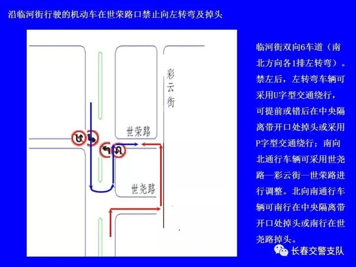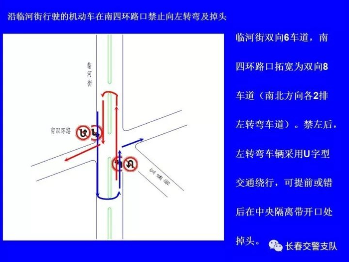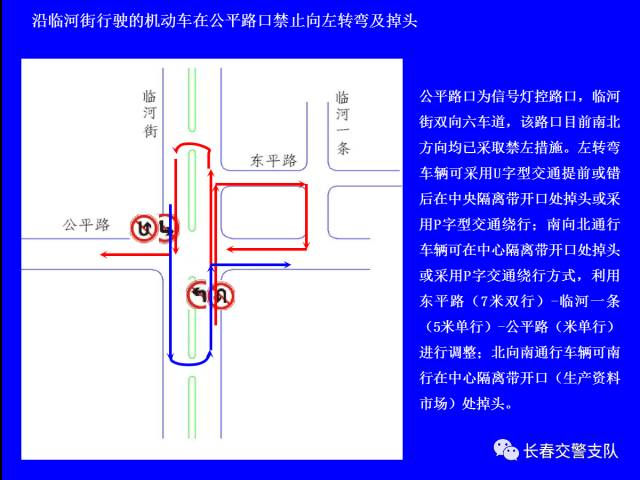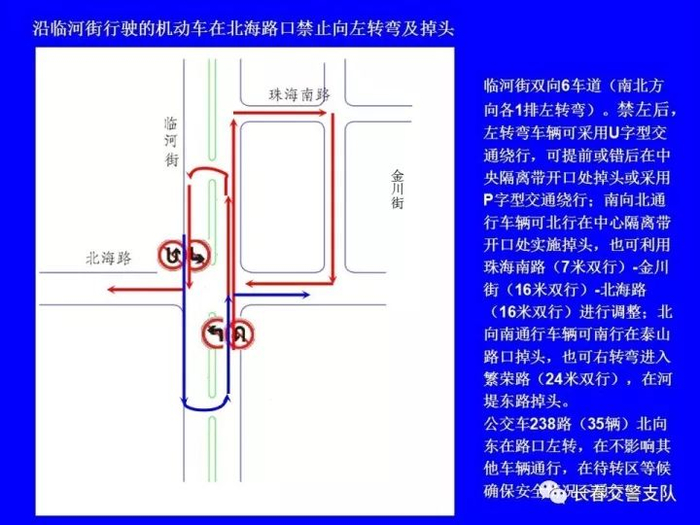 临河街(南四环路至东新路)全线长9.4公里,双6车道,共有路口22处,其中灯控路口17处;沿线中心隔离带开口41处,其中8处已采用隔离桩封闭;公交线路26条,公交车680台,在临河街上行驶的公交车有左转弯需求的338台。根据高峰时段流量调研,主要路口(卫星路、南湖大路、自由大路、吉林大路)南北直行双向车流总量平均为1300辆/小时,左转弯车流总量平均为400辆/小时。如将临河街沿线灯控路口南北方向全部禁止左转弯行驶,并重新调整信号灯配时,临河街南北方向沿线各路口通行能力将提高33%。需左转弯的车辆可采用U字型(利用中心隔离带开口允许掉头处掉头)、P字型(利用其它支路绕行)通行方式,进行方向调整。