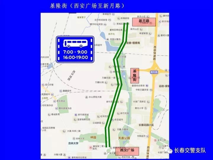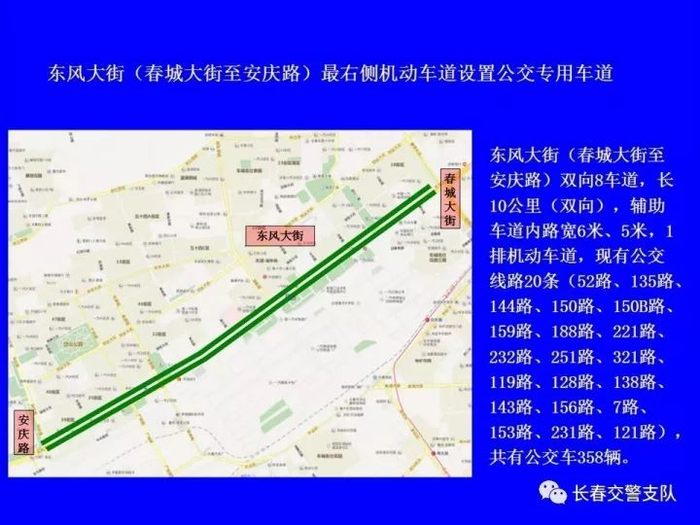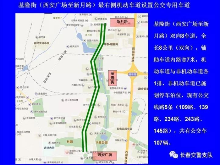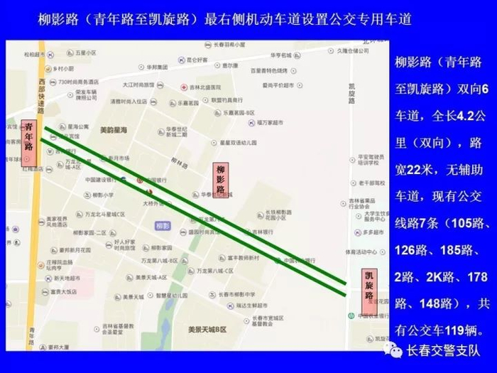 1、东风大街(春城大街至安庆路)、基隆街(西安广场至新月路)、柳影路(青年路至凯旋路)最右侧机动车道设置为公交车专用车道。