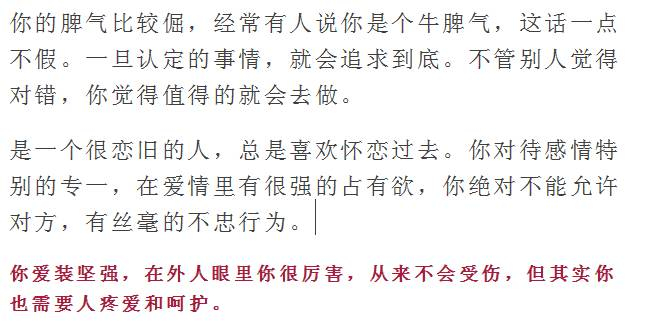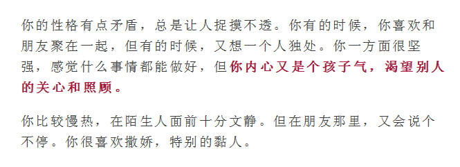你是个典型吃软不吃硬的人。别人以为你是个爱生气的人,但其实他们不知道你特别容易哄好。你自尊心特别强,特别敏感,别人一句话就有可能伤害到你的自尊。
