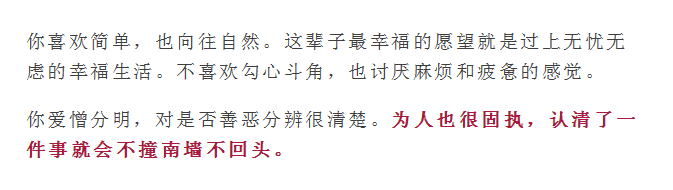 你性格特别的倔强,喜欢和人讲道理。你为人处世有自己的原则,而且不会轻易地改变它。