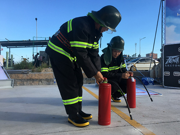 演练开始了。她娴熟地将一捆十几斤重的水带甩成直线,单手提着20斤重的灭火器,喷向一个事先点燃的火盆。