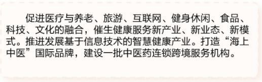 加强中医治未病服务,发挥中医药优势,加强中医药参与公共卫生服务、康复护理和健康管理,推进中医药与养生、养老融合发展。