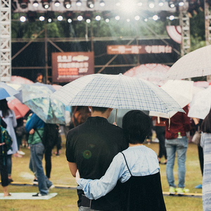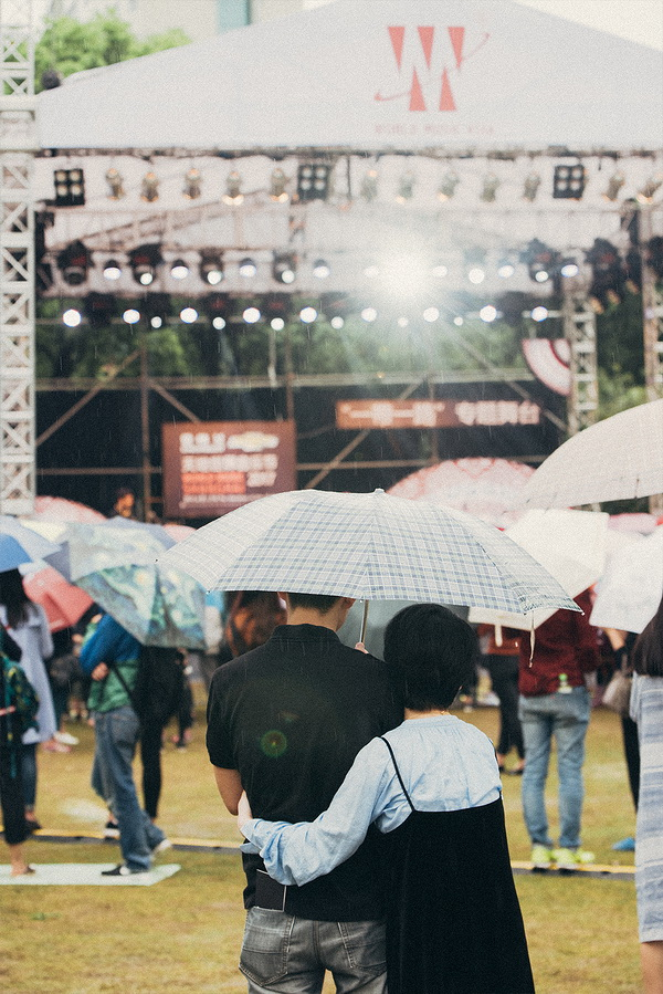 浸透水的草地晶莹地开着伞花,乐手和观众一样狼狈,小心翼翼地与工作人员一起抬起乐器箱趟过场地边缘的泥塘。