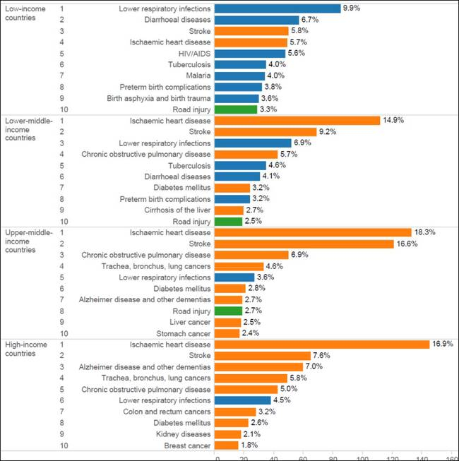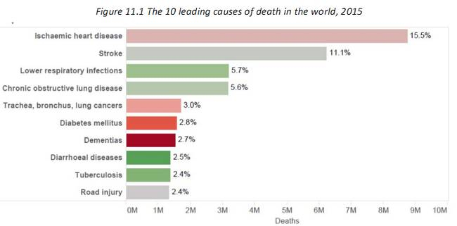 世界卫生组织给出的2015年十大死因:从上到下分别是:缺血性心脏病、中风、下呼吸道感染、慢性阻塞性肺病、支气管肺癌、糖尿病、痴呆、腹泻、结合、交通事故。