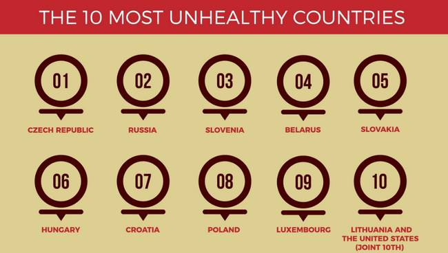 clinic compare网站评出的全球最不健康国家前十,从头到尾分别是:捷克、俄罗斯、斯洛文尼亚、白俄罗斯、斯洛伐克、匈牙利、克罗地亚、波兰、卢森堡、美国和立陶宛并列第十
