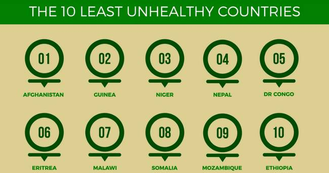 clinic compare网站评出的全球最健康国家前十,从头到尾分别是:阿富汗、几内亚、尼日尔、尼泊尔、刚果(布)、厄立特里亚、马拉维、索马里、莫桑比克、埃塞俄比亚