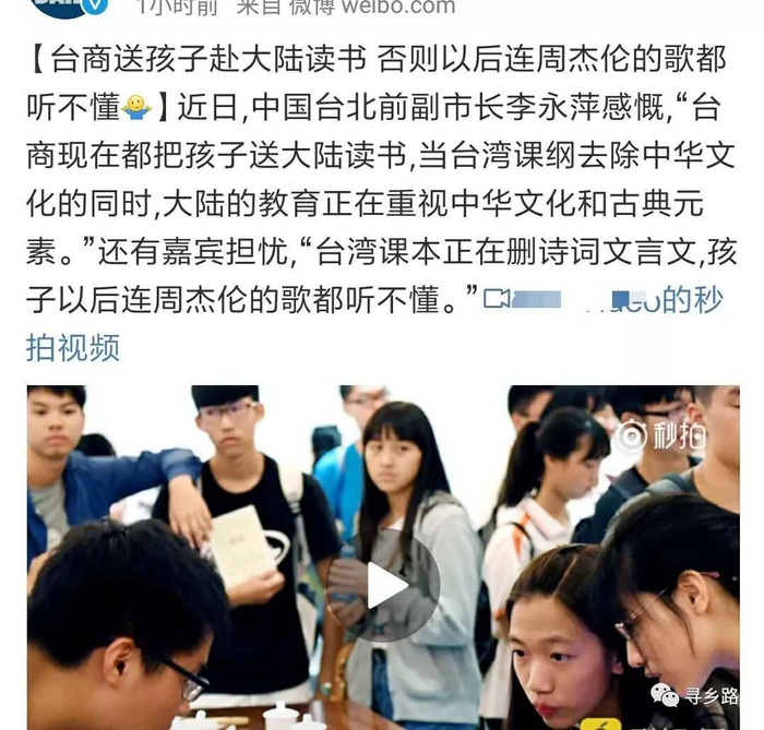 点开才发现,说的是台湾课纲删减文言文,台商纷纷送孩子到大陆来读书,学习中华文化,否则连周杰伦的歌都听不懂了。