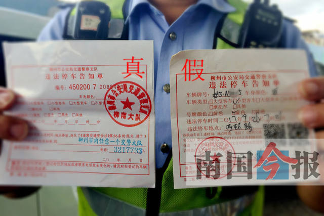 “怎么停在线内的车也挨贴单?”费女士十分纳闷,正好有柳南交警大队民警巡逻经过,她急忙跑出路边挥手求助。民警查看发现,这些罚单和自己身上带的不一样,最明显的区别在于,假罚单上多出两个二维码,上面公章是印制上去的。此外,公章全称应为“柳州市公安局交通警察支队柳南大队”,该罚单上却是“柳州市公安局交通警察支队柳州支队”。