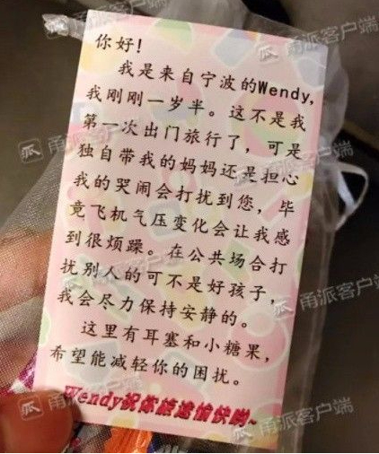 “你好!我是来自宁波的Wendy,我刚刚一岁半。这不是我第一次出门旅行了,可是独自带我的妈妈还是担心我的哭闹会打扰到您,毕竟飞机气压变化会让我感到很烦躁。在公共场合打扰别人的可不是好孩子,我会尽力保持安静的。这里有耳塞和小糖果,希望能减轻你的困扰。Wendy祝你旅途愉快哟。”