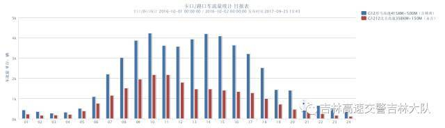2016年10月1日辖区珲乌高速(蓝色)、沈吉高速(红色)各时段车流量柱形图