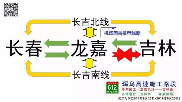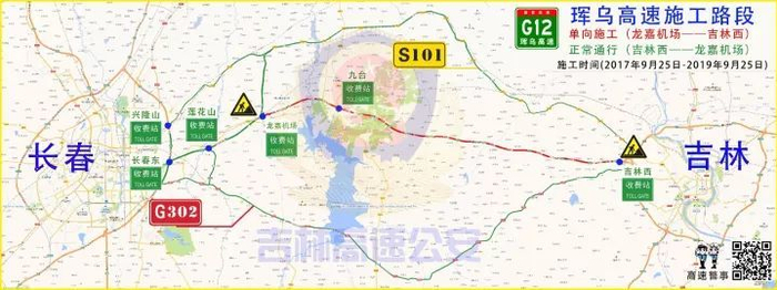 2017年9月25日至2019年9月25日,珲乌高速公里(G12)吉林至机场段改扩建施工,龙嘉机场至吉林方向全线封闭,同时龙嘉机场和九台收费站吉林方向入口也将关闭。高速封闭后,从长春去吉林方向的车辆需就近选择长春周边收费站驶离,可绕城长吉北线或长吉南线。吉林到长春可以正常通行。