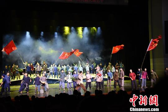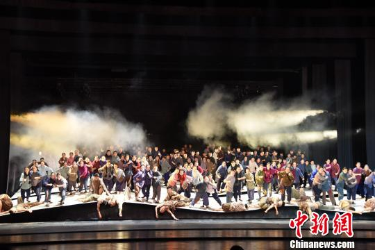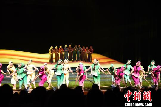 27日晚,大型音乐舞蹈史诗《为有牺牲多壮志——右玉和他的县委书记们》在保利剧院上演,将“右玉精神”生动地呈现在舞台上。 张琦 摄