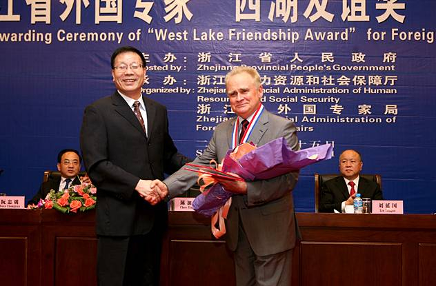 ▲高能束制造技术专家弗拉基米尔·科瓦连科接受浙江政府颁发的“西湖友谊奖”。(浙江工业大学官网)