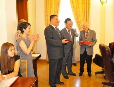 ▲资料图片:时任驻乌克兰大使张喜云向乌克兰科学家巴顿院士颁发中国政府“友谊奖”。(外交部)