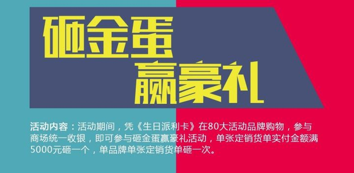 活动期间,凭《生日派利卡》在百大活动品牌购物,参与商场统一收银,即可参加砸金蛋赢豪礼活动,单张定销货单实付金额满5000元砸一个,单品牌单张定销货单限砸一次。