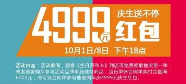 即日起至9月29日,顾客预存50元即可获《生日派利卡》一份,提前锁定红星美凯龙6周年庆生福利大派送,专享6周年庆钜惠让利。
