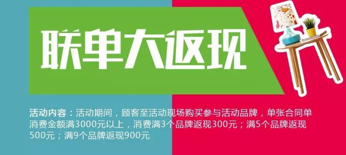 活动期间,顾客至活动现场购买参与活动品牌,单张合同单消费金额满3000元以上,消费满3个品牌返现300元;满5个品牌返现500元;满9个品牌返现900元。