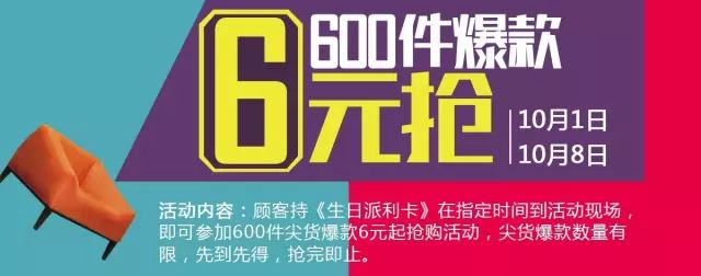 顾客持《生日派利卡》在指定时间到活动现场,即可参加600件尖货爆款6元起抢购活动,尖货爆款数量有限,先到先得,抢完即止。