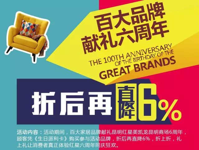 活动期间,百大家居品牌献礼昆明红星美凯龙昆明商场6周年,顾客凭《生日派利卡》购买参与活动品牌,折后再直降6%,折上折,礼上礼让利消费者,让消费者真正体验红星六周年同庆狂欢。