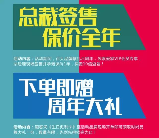 活动期间,百大品牌献礼六周年,仅限爱家VIP会员专享,总经理现场签售并承诺保价1年,买贵十倍返差!