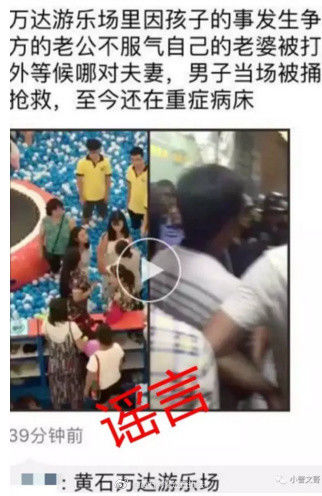 【传闻】湖北黄石、湖南湘潭、益阳以及山东烟台等地传出“在万达广场一楼游乐场,两位母亲因为娃娃的事发生争吵,随后,一女子老公因不服气自己的老婆被打,叫人在万达外等候里面那对夫妻,男子当场被捅死,女的还在抢救,至今还在重症病床”。