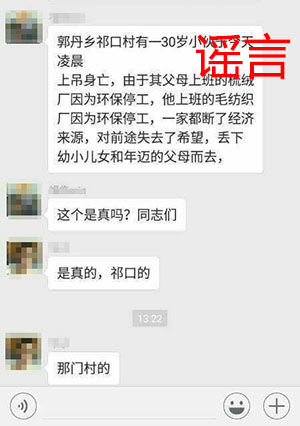 【传闻】网传“河北保定蠡县郭丹乡祁口村有一30岁小伙子今天凌晨上吊身亡。其父母上班的梳绒厂因为环保停工,他上班的毛纺织厂也因为环保停工,因为家里都断了经济来源,遂对前途失去了希望,丢下年幼的儿女和年迈的父母而去”。
