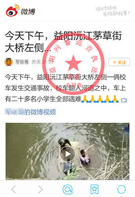 【传闻】9月7日,有网民在微博发帖称,“今天下午,益阳茅草街左侧一辆校车发生交通事故,校车翻入河道之中,车上有二十多名小学生全部遇难”,并附上现场车辆坠河视频,该消息很快被部分网民转发。