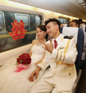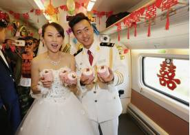 哈尔滨西站站台上,26岁的陈冬西装笔挺,手中捧着火红的玫瑰花,春风满面,齐客运段列车值班员马妍一身洁白婚纱幸福地挽着他的手臂,在近百名亲朋好友的簇拥下走进D6907次列车车厢。今天是他结婚的日子,他们要赶到大庆去举办婚礼,而这趟白色的动车组,就是他们的婚车。