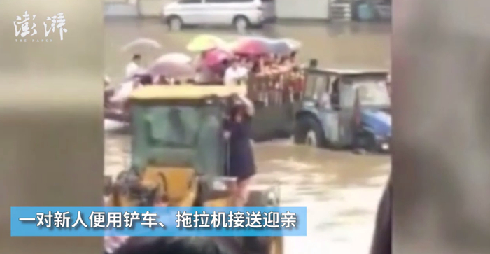 同样是在暴雨天,山东临沂罗庄区一家酒店门口积水严重,一对新人无奈只用铲车、拖拉机接送迎亲,新郎更是背着新娘趟过积水去酒店。