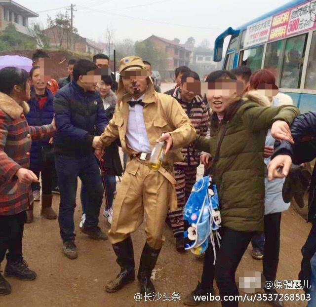 2017年1月18日,湖南邵阳云水铺一小伙上演搞笑接亲现场。新郎被亲朋好友装扮成“鬼子”模样,手拿“长抢”,腰上挂啤酒瓶,脸上画成“日本人”的样子,口中还说 “八格牙路” ,去新娘家接亲。村民说这习俗是测试新郎爱新娘有多深。