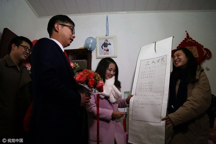 过五关斩六将以后,2017年2月4日,合肥新郎宋先生被新娘亲朋要求在新“三从四德”保证书上签字,并涂满口红在保证书上留印为证。“太太说话要服从;太太出门要跟从;太太命令要盲从。老婆化妆要等得;老婆花钱要舍得;老婆生气要忍得;老婆生日要记得。”