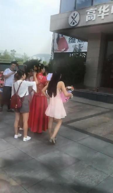 最近,在重庆万州江南新区南滨路一酒店门口,一穿着中式婚服的新娘与伴娘在酒店门口跳舞,宣读保证书等等经历重重考验接新郎,开婚车的司机也表示“今天女的接男的哟,第一回看到起”。