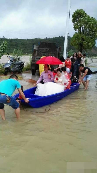 当天,雨水已经漫过人的腰部,新娘从竹梯爬上二楼完成了结婚仪式。