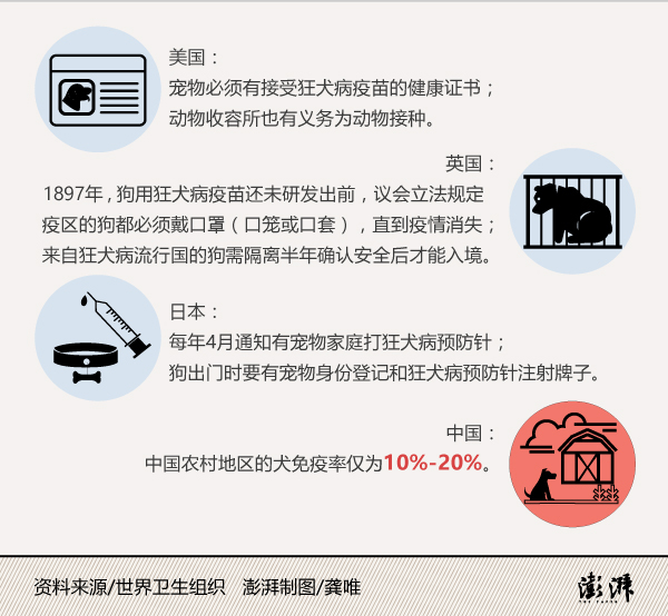 然而,我国大部分地区的犬、猫免疫率低,农村地区的犬免疫率仅为10%-20%,无法形成免疫屏障。每当狂犬病疫情上升时,相关部门通过灭犬等措施使狂犬病疫情得到一定程度的控制。但由于缺乏狂犬病防治长效机制,每当疫情回落,一些地方就会放松防治工作,疫情便再度上升。狂犬病专家严家新在2011年的《南方周末》专栏中就曾直言,狂犬病问题的根结就在于“农业部管的狗咬了卫生部管的人”,要管好狗才能控制住狂犬病。