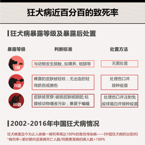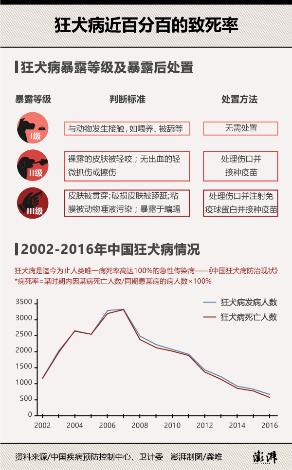 根据中国疾病预防控制中发布的《狂犬病预防控制技术指南(2016)》介绍,狂犬病暴露可分为三个等级,根据不同等级采取相应处置。龙女士的伤情被诊断为II级暴露,因此只接种了狂犬病疫苗而未注射狂犬病毒的免疫球蛋白。 然而,一旦感染狂犬病,就有近百分百的死亡率。