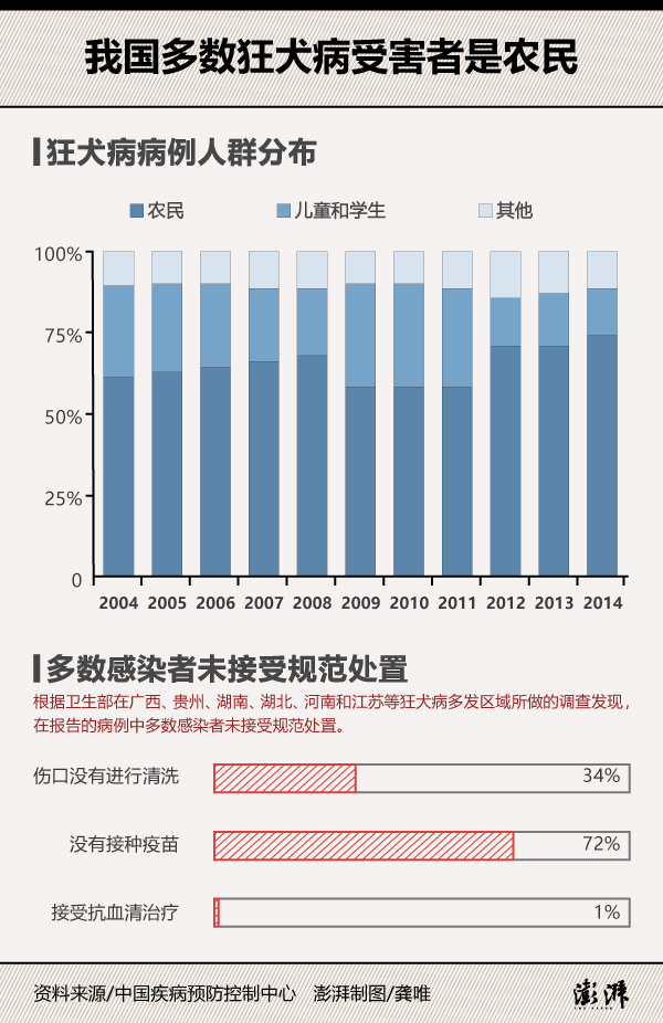 中国超一半的狂犬病感染发生在农村,不仅是因为农村地区猫狗密度高(据调查,我国南方农村地区犬密度可高达15至20只/100人),更根本的是农村地区较缺乏防治知识、经济负担不起和专业救治门诊不足。