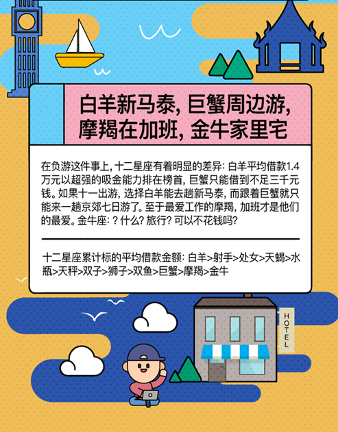 这个十一跟谁走呢?不要再为这个问题苦恼了。根据《借钱旅行大数据报告》,白羊座累计能够借到超过1.4万元,而巨蟹座则累计能借到不足三千元钱,而单次能借到钱则不足千元。这个十一长假,跟着白羊座能够去一趟新马泰,而跟着巨蟹座或许只能来一趟京郊一日游。
