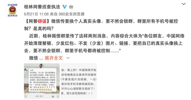 近日,有桂林网民表示收到了一条“中国网络监控在清理整顿,要求微信群友将头像更换为个人真实头像,否则会被锁群,群成员的手机号也会被控制”的消息。不止广西桂林,吉林白城、宁夏石嘴山等地也传出了类似消息,内容都大同小异, “紧急通知!从明天早晨3点到晚上10点,所有人都不要发任何图片和链接,因为中国网络监控在清理整顿,有给闭群的危害!一旦被闭群,我们群里每个人的手机号都被控”。