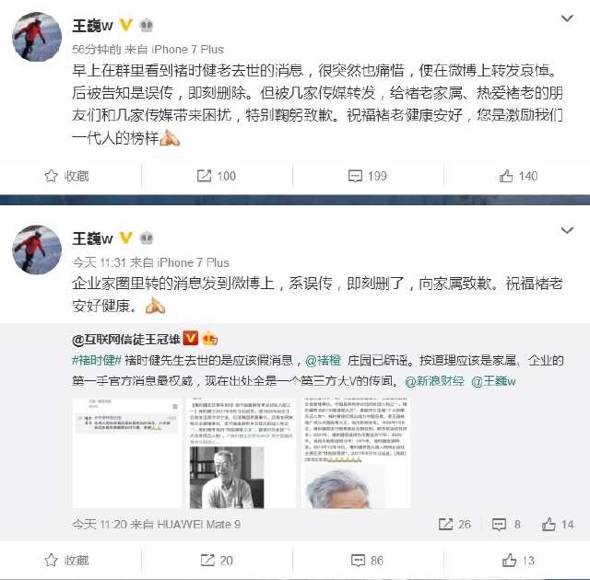最初的发布者王巍也在微博中辟谣致歉,“早上在群里看到褚时健老去世的消息,很突然也痛惜,便在微博上转发哀悼。后被告知是误传,即刻删除。但被几家传媒转发,给褚老家属、热爱褚老的朋友们和几家传媒带来困扰,特别鞠躬致歉。祝福褚老健康安好,您是激励我们一代人的榜样。”
