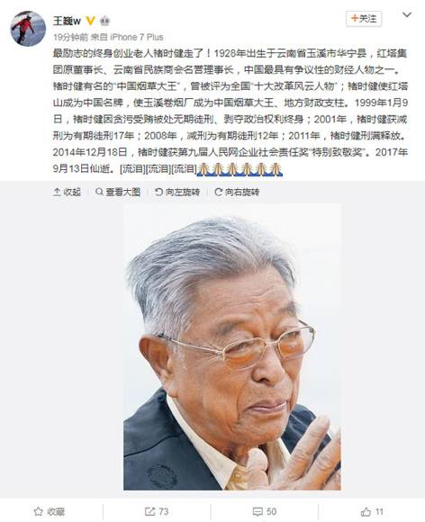 9月13日上午,认证为“中国金融博物馆理事长王巍”的博主称知名企业家、原云南红塔集团董事长褚时健去世,享年89岁。