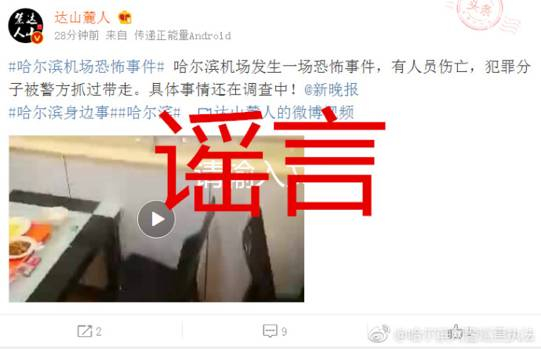2017年9月21日,微博网民“达山麓人”发布题目为“哈尔滨机场恐怖事件”的博文内附2分10秒现场视频称,哈尔滨机场发生一场恐怖事件,有人员伤亡,犯罪分子被警方抓获带走,具体事情还在调查中!该视频还大量在微信群内转发,称是哈尔滨机场事件。