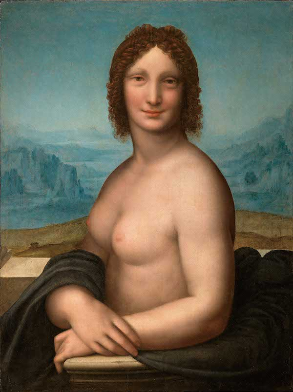 除此以外,大厅里面最重要的是背靠背的两幅油画作品,其中之一便是16世纪的这幅《蒙娜丽莎》。在其背面是《裸体乔康达》,被认为是达·芬奇工作室的作品,其执笔人为达·芬奇的弟子萨莱(Salai)。策展人沈其斌在开幕导览的时候介绍说萨莱是达·芬奇最喜爱的学生和情人,而这幅作品描绘的对象其实是年轻时候的蒙娜丽莎。“(它)与卢浮宫的《蒙娜丽莎》既有相似之处,也有不同之处。凝视的眼神既迷人且清澈,身体略向一侧倾斜,手的位置、画面的空间布局,以及塑像般的裸体展示……这会是一个人的肖像吗?”