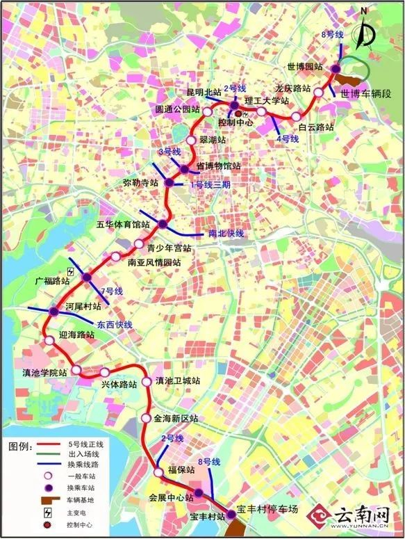 据介绍,5号线是昆明轨道交通线网中的一条辅助加密线,基本与中部城市发展轴重合,沿线途经昆明主城东北部世博园片区、主城圆通公园片区、主城西南部会展中心片区,串联昆明世博园、圆通山、翠湖、滇池度假区等昆明最具山水园林和历史文化景观风貌代表性的旅游精品区。