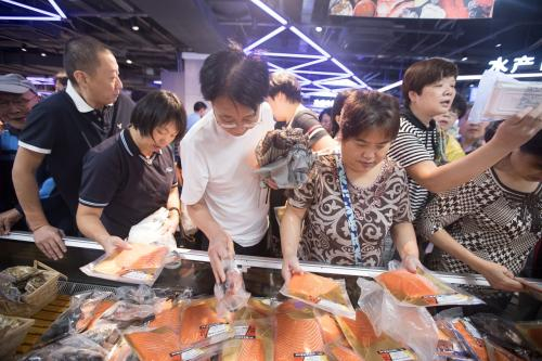 图为杭州市民在盒马鲜生店内选购场景。