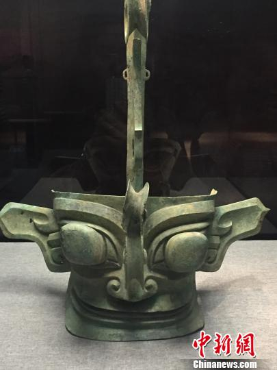 当日展览中,被誉为四川广汉三星堆博物馆镇馆之宝的一副商代“铜戴冠纵目面具”引得观众纷纷驻足观看。该面具呈方形,眼睛呈柱状向外凸,一双雕有纹饰的耳朵向两侧充分展开,其整体造型意象神秘诡谲,风格雄奇华美,在三星堆各类人物形象中颇显特殊。