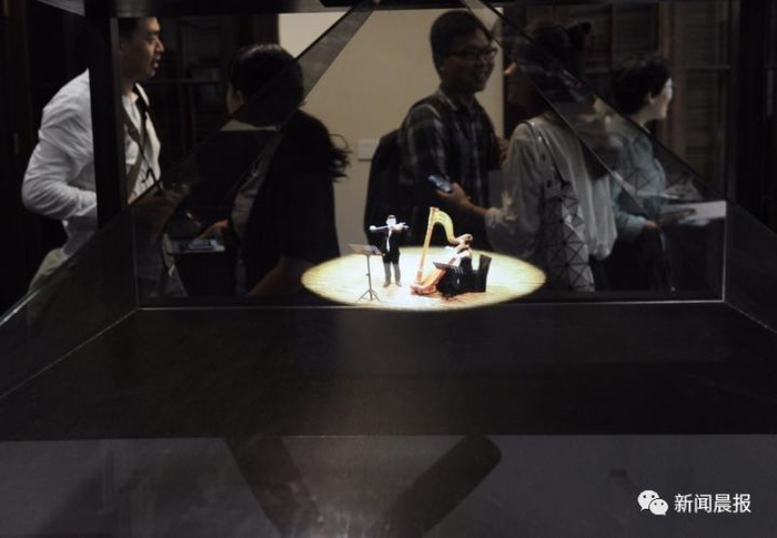 在这个用玻璃搭建的金字塔形装置前,观众不仅可以带上耳机,听一场音乐会,更可以从四面透露的玻璃中,通过全息影像技术,同步“实景”观看到音乐会的现场。