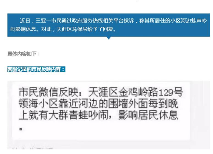 三亚一市民投诉蛙声扰民,天涯区环保局的“神回复”亮了!