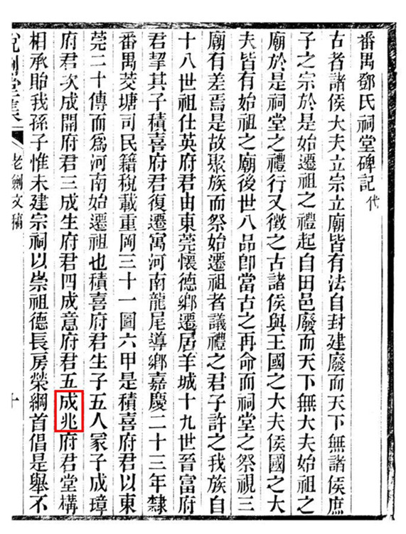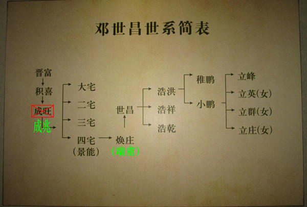 今广州邓世昌纪念馆“邓世昌世系简表”,在20世邓积喜的下面,列出第21世(邓世昌曾祖父)为“成旺”,与潘飞声《番禺邓氏祠堂碑记》中所列的“成璋、成开、成生、成意、成兆”无一相符。潘飞声1896年的碑记,是按照当时邓氏家族主事人提供的世系表撰写,用来刻石立碑。邓世昌纪念馆在1994年修复时,依据邓氏家族后人提供的材料写成“世系简表”,那么,有极大的可能是在此时生造出一个“成旺”,用来代替原有的“成兆”。