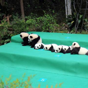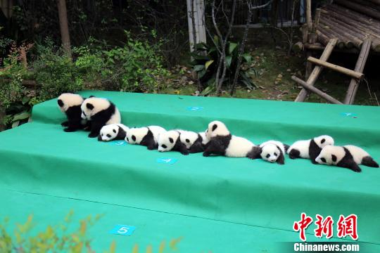 中新网成都9月29日电 (记者 安源)29日,记者从成都大熊猫繁育研究基地获悉,该基地今日为2017年出生的11只新生大熊猫举行了隆重的亮相活动。2017年,大熊猫基地成功繁育并存活大熊猫幼仔8胎11仔,其中包括3对双胞胎以及海外出生的1仔大熊猫,成绩喜人。